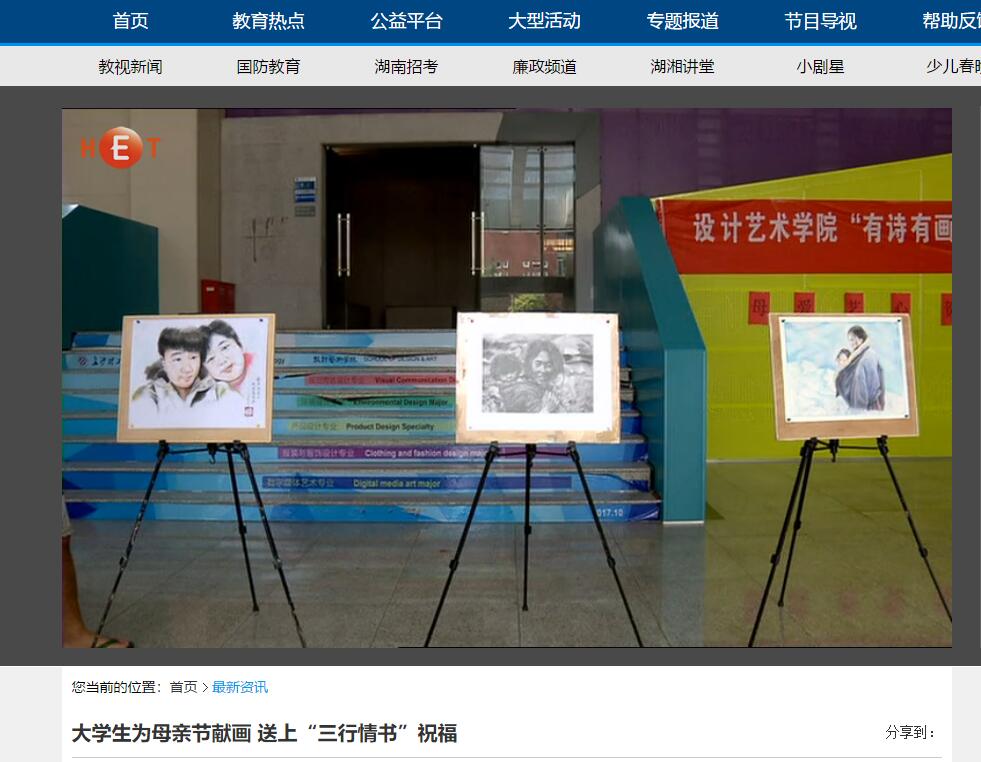 湖南教育电视台5月14日对我校设计艺术学院组织的母亲节“三行情书”送祝福活动进行了宣传报到。经过两个星期的精心准备,设计艺术学院的学生为母亲献上了自己用心绘制的画作,并以“三行情书”的形式录制了祝福视频,向母亲表达了爱与祝福。近年来,设计艺术学院契合节日主题,将学生专业教育与弘扬中华传统文化和社会主义核心价值观教育相结合,开展了一系列积极向上的校园文化活动。