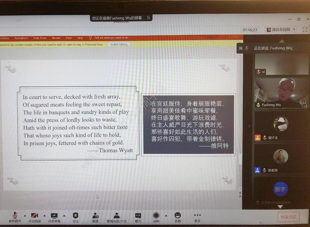 11月21日上午9:30,美国犹他大学终身教授、美国布朗大学比较文学博士、南开大学特聘讲座教授、四川大学客座教授吴伏生受邀,通过腾讯会议作了以“中英传统诗歌中的宫体怨情诗”为主题的线上学术讲座。讲座由文新系郑劭荣教授主持,来自文新系各级研究生、本科生、部分老师以及校外人士110余人听取了讲座。
