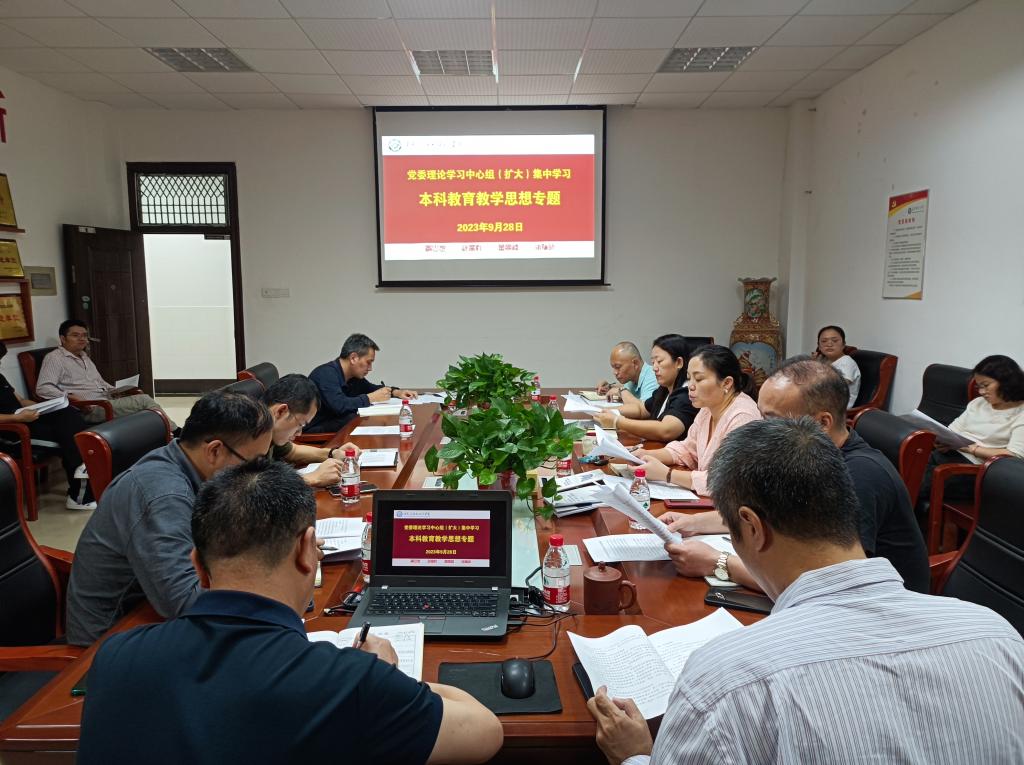 9月28日,学院党委理论学习中心组(扩大)在工一B505会议室召开本科教育教学审核评估专题学习研讨会。院党委书记丁丹主持会议并领学,副院长唐欣、副书记陶双做专题发言。各系系主任、党支部书记,各科室负责人,各年级辅导员及教务办全体人员参加。